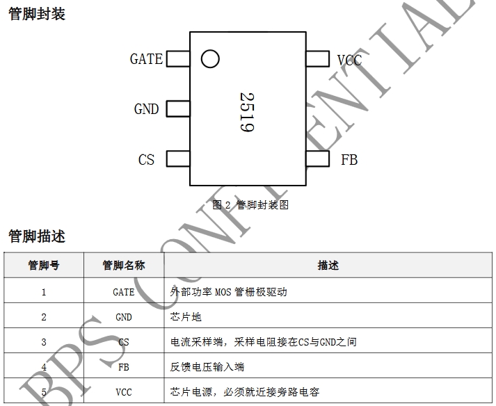 引腳排列:BP2519芯片的引腳按照功能分區排列,電源引腳通常位于芯片的一側,而控制引腳和保護引腳則分布在其他區域。