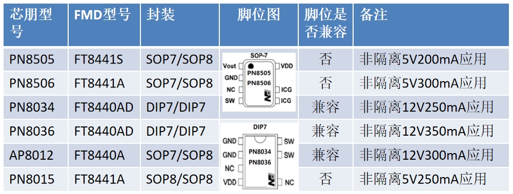 芯朋微的PN8034和PN8036型號(hào)與FT8440AD在封裝和腳位上完全兼容。PN8034是非隔離12V250mA應(yīng)用,而PN8036是非隔離12V350mA應(yīng)用,F(xiàn)T8440AD能夠無(wú)縫替代這兩款型號(hào),無(wú)需對(duì)電路進(jìn)行任何修改,即可實(shí)現(xiàn)相同的功能和性能。