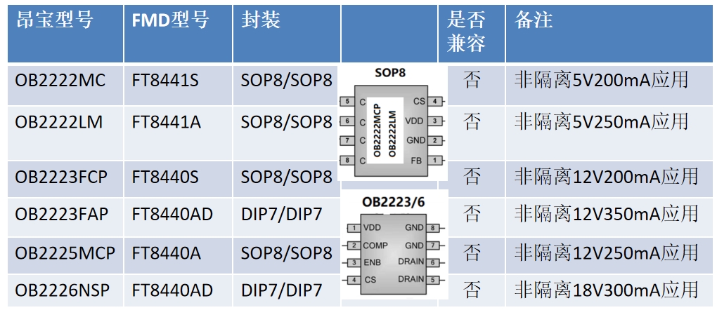 昂寶的OB2223FCP和OB2223FAP型號(hào)與FT8440S和FT8440AD在功能和性能上具有相似性。雖然在封裝和腳位上不完全兼容,但通過(guò)簡(jiǎn)單的電路調(diào)整,F(xiàn)T8440系列芯片可以替代這兩款型號(hào),為用戶提供更加高效和可靠的電源解決方案。