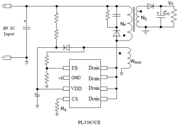 PL3367CE具有低啟動電流,可以采用大的啟動電阻以及小的VDD電容以降低應(yīng)用中的功率損耗。其工作電流很低,再加上特有的復(fù)合模式控制,從而提高了系統(tǒng)的效率,特別是系統(tǒng)處于輕載條件下。