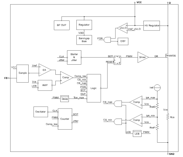 FT8440E功率開(kāi)關(guān)管每次開(kāi)啟時(shí),采樣電阻上都會(huì)產(chǎn)生毛刺電壓。為了避免誤觸發(fā),內(nèi)部集成了前沿消隱模塊,因此無(wú)需傳統(tǒng)的外部RC濾波元器件。在消隱時(shí)間Tleb內(nèi),過(guò)流保護(hù)比較器被關(guān)閉。