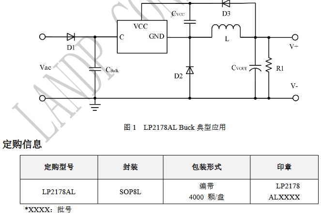 LP2178AL是一款高效率、高精度的非隔離降壓開關(guān)電源恒壓控制驅(qū)動芯片,其內(nèi)部集成高壓功率管,采用恒壓控制模式,系統(tǒng)可工作于CCM和DCM模式。采用特有的PFM控制方式,改善音頻特性。外圍應(yīng)用簡單,可靠性強。典型應(yīng)用圖如下所示