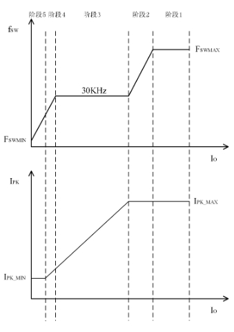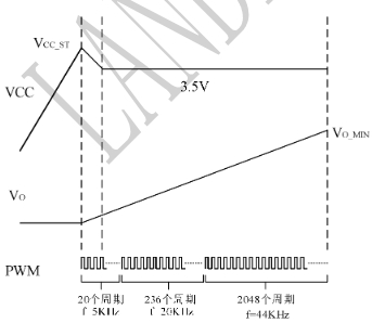 通過啟動電路給VCC電容充電,VCC達到啟動電壓VCC_ST,芯片輸出PWM開關(guān)信號。此時輸出電壓開始上升,因輸出電壓還小,VCC電壓會下降到3.5V,VCC通過自供電維持在3.5V。PWM開關(guān)信號經(jīng)過以下3個階段,軟啟動結(jié)束。軟啟動結(jié)束時,輸出電壓上升到VO_MIN:若VO_MIN>3.5V,芯片正常工作;若VO_MIN<3.5V,芯片輸出短路保護。