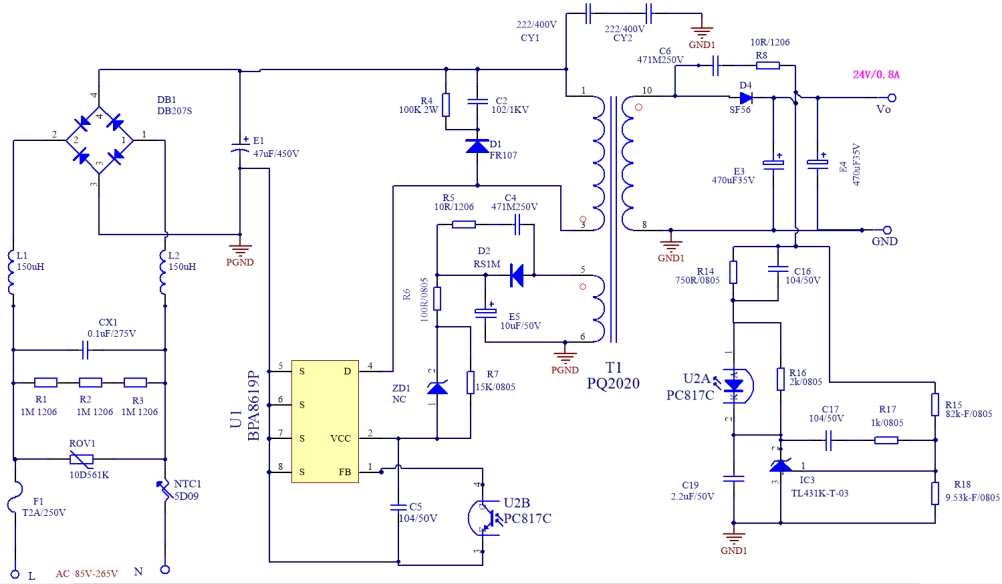 BPA8619P 的電路圖是整個(gè)電源方案的核心,它詳細(xì)展示了電源電路的各個(gè)組成部分以及它們之間的連接關(guān)系。從電路圖中可以看出,該電源采用了典型的反激式開(kāi)關(guān)電源拓?fù)浣Y(jié)構(gòu),這種結(jié)構(gòu)具有電路簡(jiǎn)單、成本較低、易于實(shí)現(xiàn)等優(yōu)點(diǎn),同時(shí)也能滿足較高的性能要求。