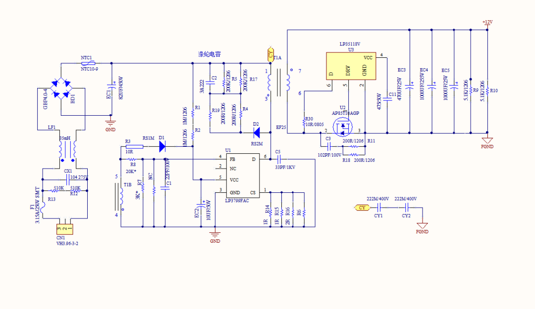 LP3799FAC的原理圖設(shè)計(jì)體現(xiàn)了其高度集成和優(yōu)化的特點(diǎn)。電路圖中,我們可以看到主要的電源管理IC(U1),以及與之配合的外圍元件,包括輸入濾波器、變壓器、輸出整流和濾波電路等。電路設(shè)計(jì)中還包含了多重保護(hù)機(jī)制,如輸入過欠壓保護(hù)、輸出短路保護(hù)、過溫保護(hù)等,確保電源方案的穩(wěn)定性和安全性。