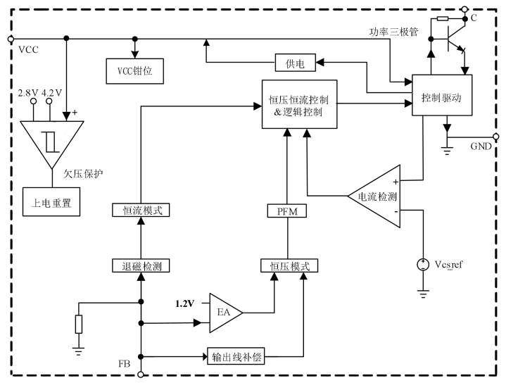 3667系列芯片的內(nèi)部框架圖揭示了其高度集成的設計理念。如圖3所示,芯片內(nèi)部集成了功率三極管、VCC供電電路、恒壓恒流控制邏輯、欠壓保護、電流檢測、上電重置、退磁檢測等功能模塊。這種高度集成的設計不僅減少了外圍元件的數(shù)量,還提高了系統(tǒng)的可靠性和穩(wěn)定性。