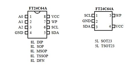 FT24C64A-ESR 提供多種封裝選項(xiàng),包括 8 引腳 DIP、SOP、MSOP、TSSOP、DFN 和 5 引腳 SOT23、TSOT23。引腳功能如下: