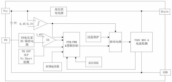 BP8519C在系統(tǒng)上電后,BUS電容通過功率管給VCC電容充電,當(dāng)VCC電壓達(dá)到芯片開啟閾值后,芯片內(nèi)部控制電路開始工作。芯片內(nèi)置7V穩(wěn)壓管,用于VCC電壓鉗位。FB引腳通過采樣電阻在芯片功率管turnoff階段直接采樣輸出電壓,內(nèi)部調(diào)節(jié)保持較高的輸出電壓精度。