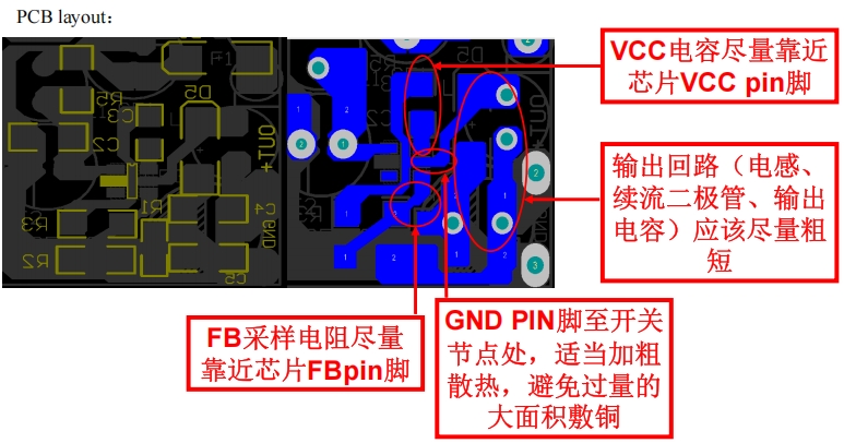 VCC電容應(yīng)盡量靠近芯片VCC引腳,輸出回路(電感、續(xù)流二極管、輸出電容)應(yīng)盡量粗短,F(xiàn)B采樣電阻應(yīng)盡量靠近芯片F(xiàn)B引腳,GND引腳至開關(guān)節(jié)點處,適當(dāng)加粗散熱,避免過量的大面積敷銅。
